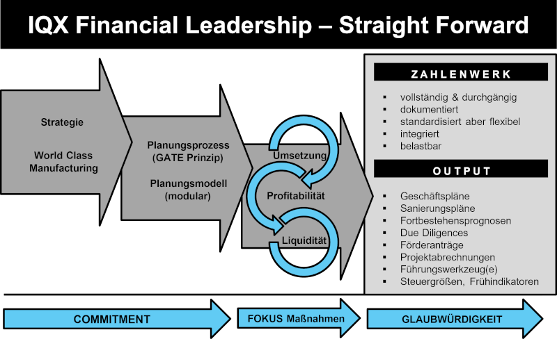 Die Zielsetzung liegt in der Sicherstellung der finanziellen Stabilität eines Unternehmens. Die IQX Group hat eine Reihe von Unternehmen saniert, die allesamt ein ähnliches Muster in deren Historie hatten. Aufbauend auf dieser Erkenntnis wurde ein Methodenkoffer entwickelt, der – richtig angewendet – eine Früherkennung und eine Vermeidung unzähliger, unangenehmer Problemsituationen zulässt.